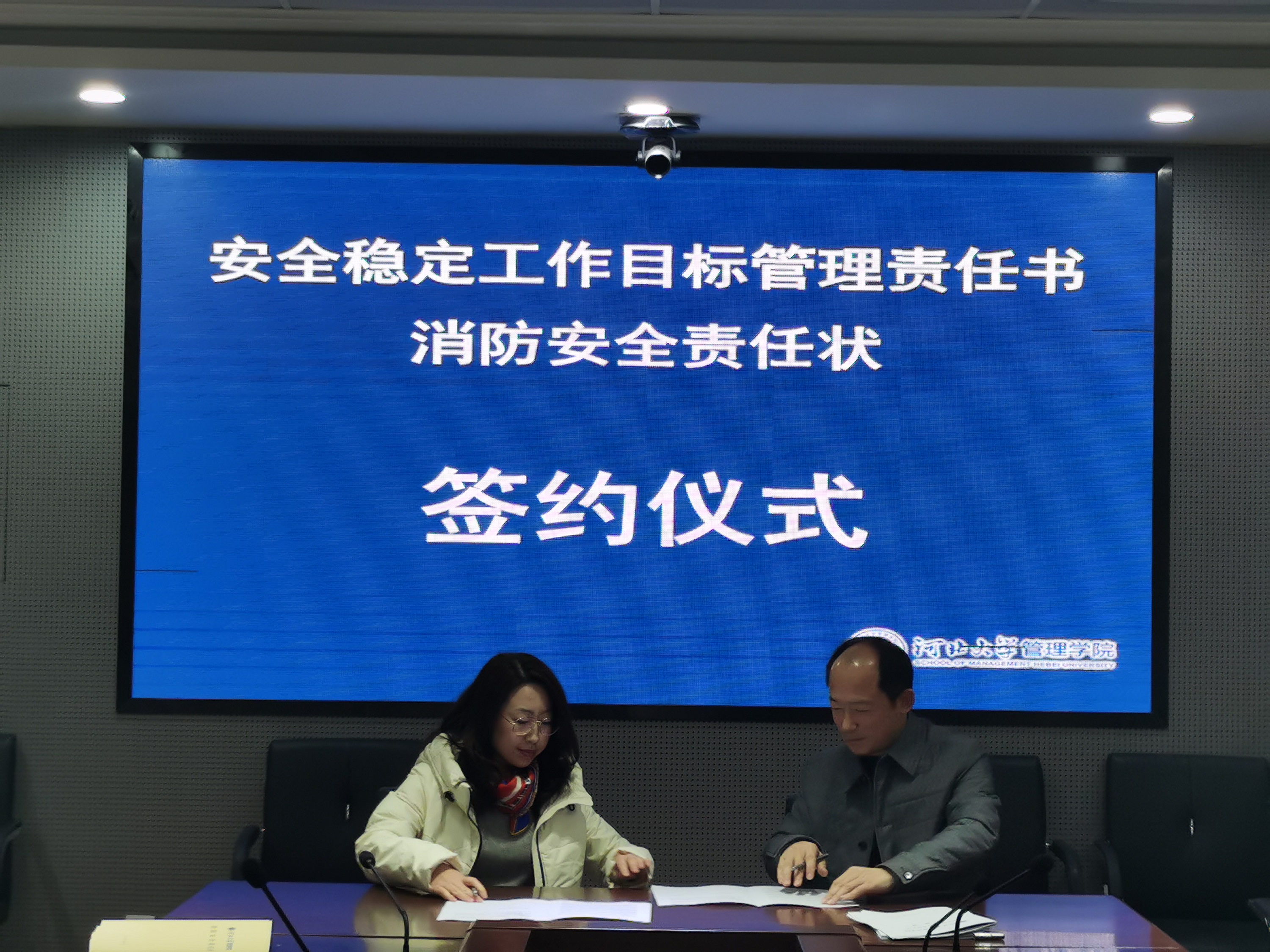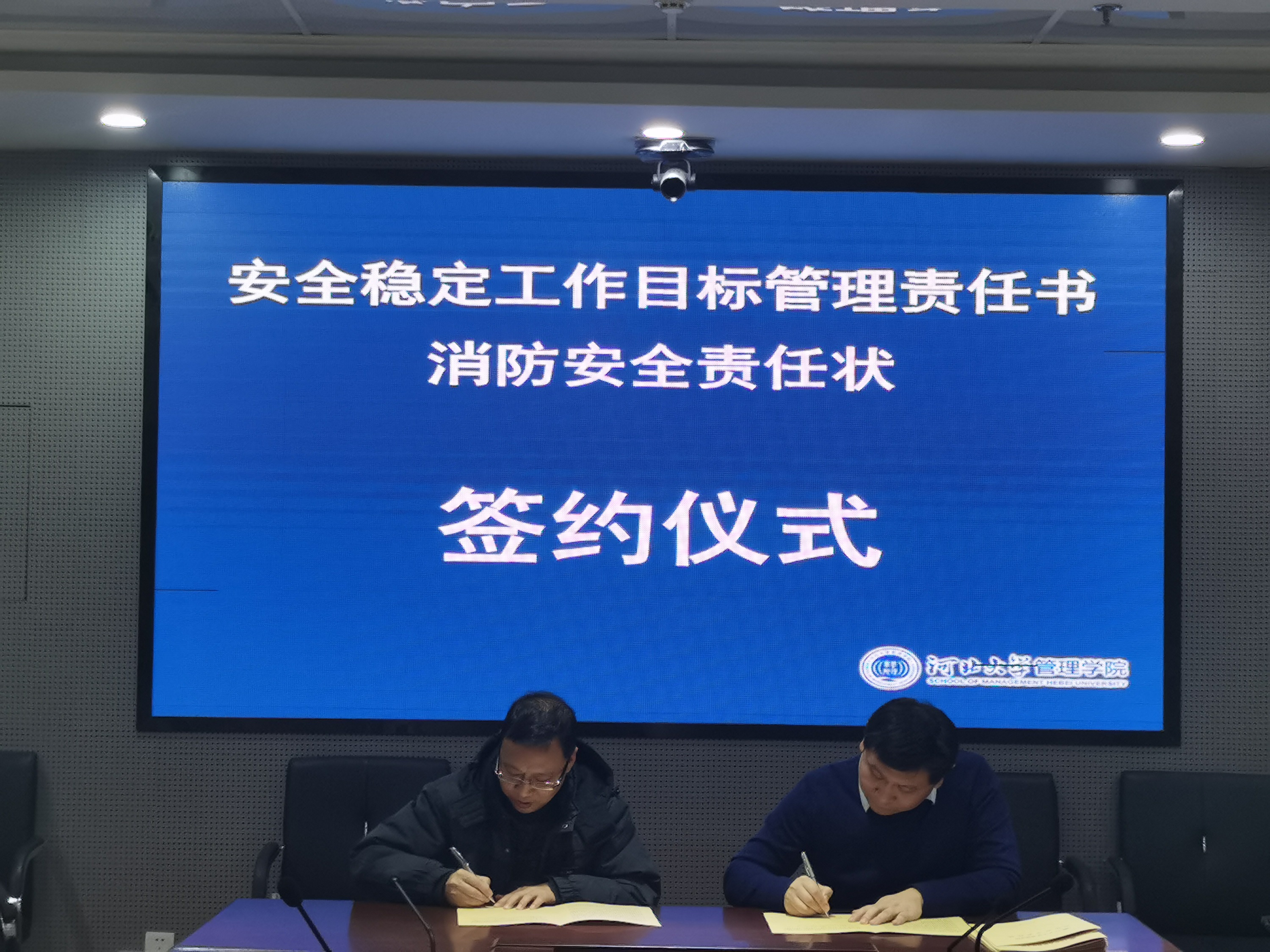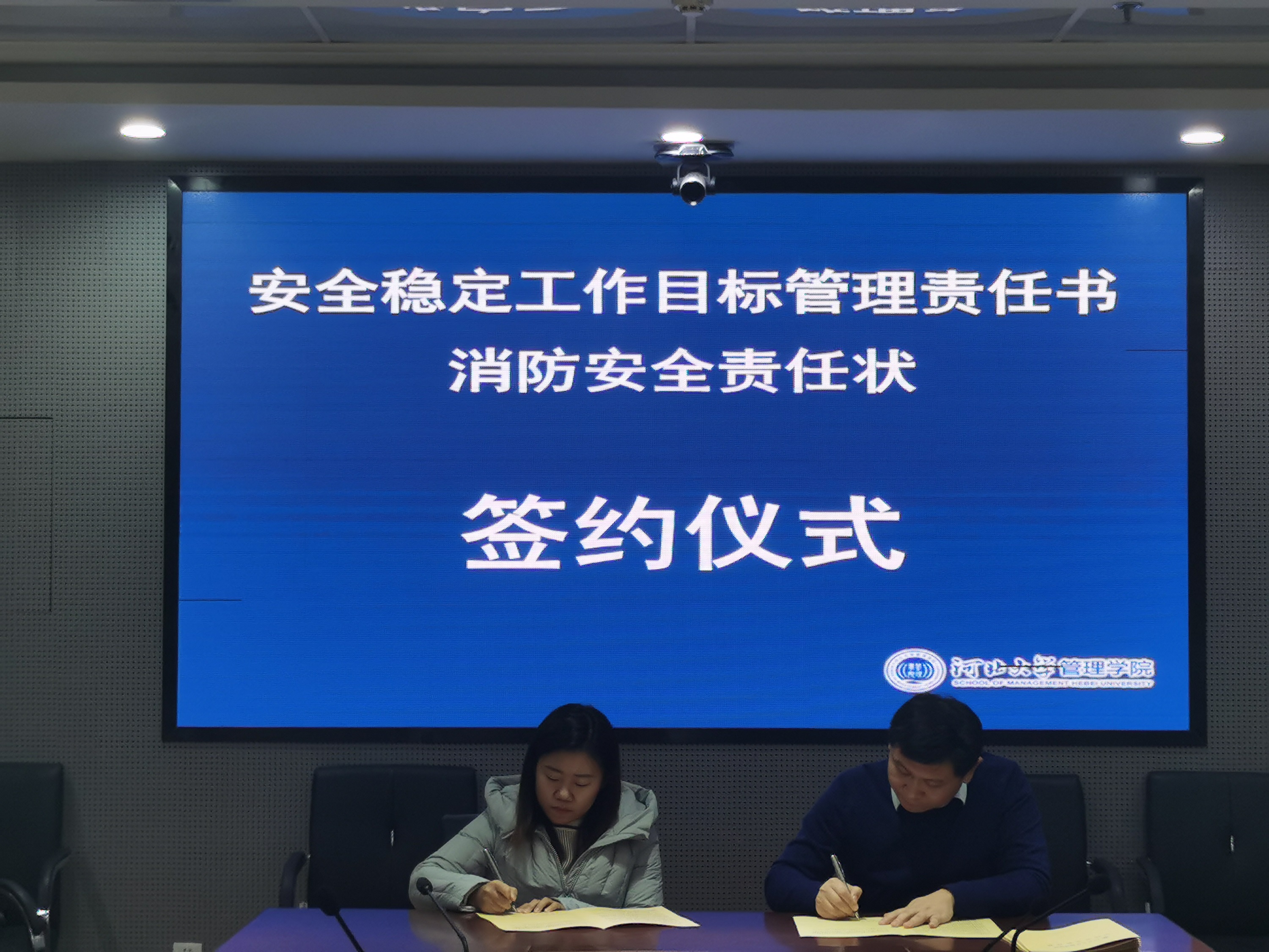 12月31日,管理学院在新区会议室举办安全稳定工作目标管理责任书和消防安全责任状签约仪式。我院党委书记赵林涛、院长段洪波分别与各科长、各系主任签订了2021年安全稳定工作目标管理责任书和消防安全责任状。