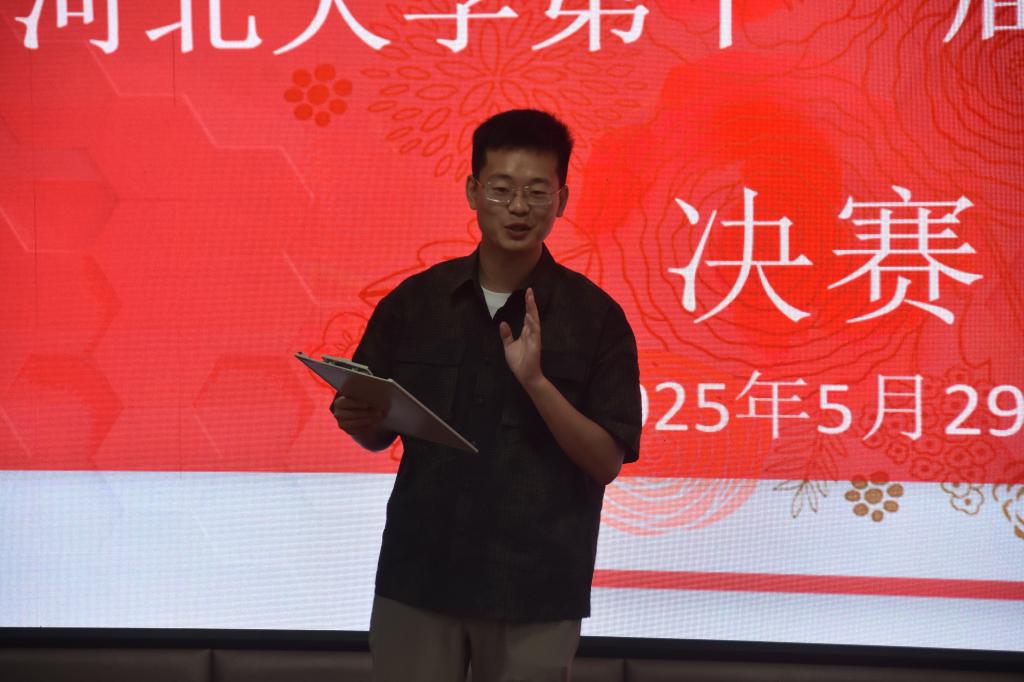 5月29日,由河北大学团委主办、管理学院团委承办的河北大学第十一届超级演说家决赛在七一路校区A2-209举行。管理学院党委副书记张丽、保定电视台《直播民生》节目主持人、河北省第九届“好记者讲好故事”演讲比赛一等奖获得者刘育松、保定新闻传媒中心时政要闻部记者、第十届好记者讲好故事河北省一等奖、河北新闻界好记者讲好故事巡讲团成员齐域宽、河北大学团委宣传与新媒体工作部主任许珂、河北大学管理学院团委书记谷童玮、河北大学建筑工程学院团委书记史文佳、河北大学管理学院专职辅导员赵坤、河北大学新闻传播学院2022级播音主持专业何圳昊出席了比赛。