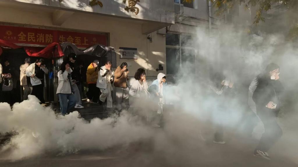 下午三点整,疏散逃生演练正式开始。演练模拟梅园四号公寓二层宿舍突发“火情”,发现险情的同学第一时间向公寓值班员报告,值班员迅速响应并启动应急处置程序,同步开启安全通道、切断相关区域电源,有序组织人员疏散。参与演练的同学们严格遵循预定疏散路线,以湿毛巾捂住口鼻,保持沿墙弯腰低姿前行的正确姿势,沉着有序撤离。整个过程中,师生配合默契、从容不迫,现场秩序井然,所有人员在规定时间内快速、高效抵达指定安全区域,圆满完成疏散任务。