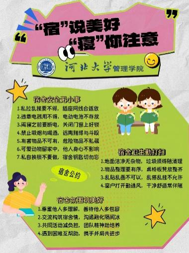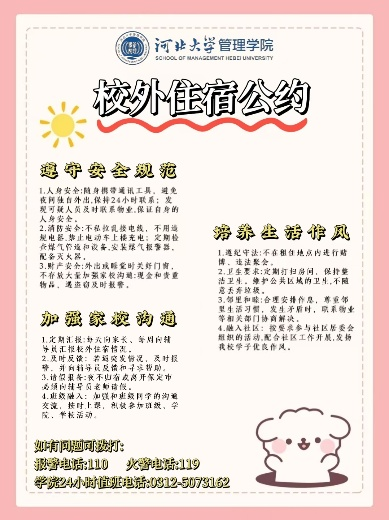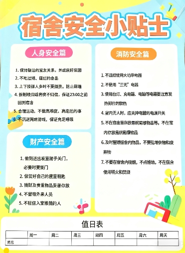 为让安全规范“看得见、记得住”,学院制定了宿舍安全小贴士、宿舍公约等宣传单发放到每个宿舍,统一贴于宿舍门后;同时为在校外住宿的同学发放了校外住宿安全提醒。这些宣传材料以简洁明了的语言和醒目的设计,详细列出了用电安全、防火防盗、禁止使用违规电器、保持消防通道畅通等核心注意事项,将安全意识融入学生的日常生活,于细微处着手,引导同学们从思想上重视安全,自觉遵守规章制度,共同签署并遵守这份“家的约定”,从源头上预防安全事故的发生。