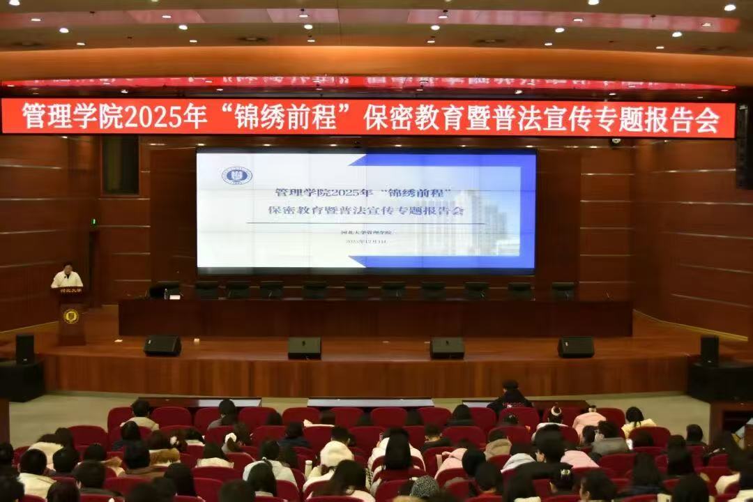 2025年12月4日是第十二个国家宪法日。为提升师生保密意识与法治素养,增强校园安全防线,当天下午,管理学院在新校区图书馆报告厅举行“锦绣前程”保密教育暨普法宣传专题报告会。河北大学保密委员会办公室副主任王珏、北京市京师(保定)律师事务所律所主任王刚应邀为师生做报告。管理学院党委副书记张丽、团委书记谷童玮、专职辅导员胥昊宇以及各年级本科生、研究生代表共计400余人参加了报告会。会议由张丽主持。