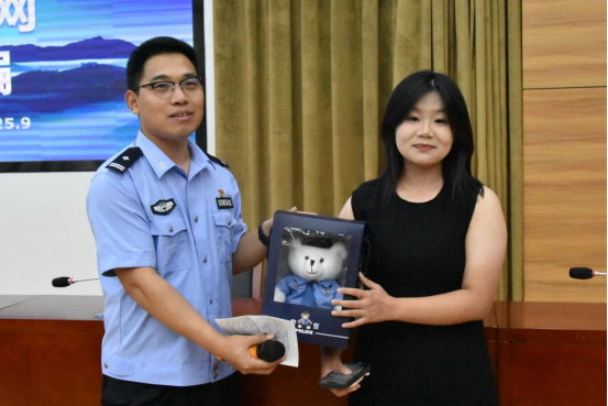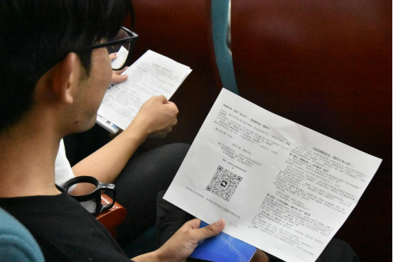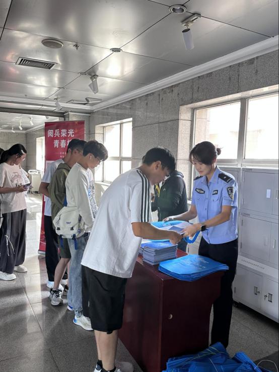 报告会开始前,保定市公安局网安支队的警官和网安宣讲志愿者们向同学们发放了宣传资料。