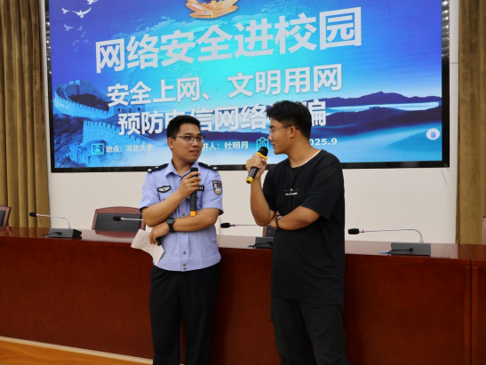 报告会一改往日单向灌输的模式,现场氛围热烈活跃。杜明月队长精心设置了几类大学生最容易遭遇的诈骗“名场面”:如“假冒客服退款诈骗”、“虚假兼职刷单陷阱”、“冒充熟人借钱”等。通过邀请学生上台进行情景模拟扮演,让同学们身临其境地感受诈骗过程。杜队长在每个情景表演后“画龙点睛”,一针见血地剖析诈骗分子的常用话术和心理操控技巧,并现场传授“破局”妙招。他还现场演示了“国家反诈中心”APP使用方法和国家网络身份认证的流程。这种零距离、沉浸式的宣讲,极大地调动了同学们的参与热情,在寓教于乐中将安全知识深植于心。