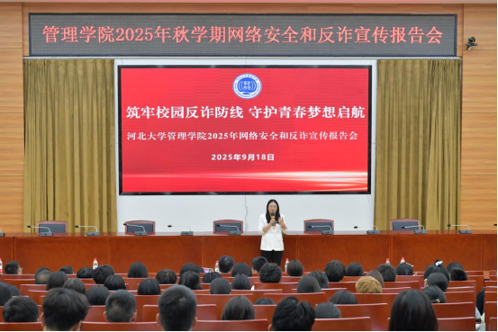 为增强大学生网络安全意识,提高防范电信诈骗能力,营造安全稳定的校园环境,9月18日下午,管理学院在五四路校区主楼304报告厅举办了网络安全与反诈宣讲报告会。保定市公安局网安支队大队长杜明月、管理学院院长杨文杰、党委副书记张丽、团委书记/学工办主任谷童玮、专职辅导员胥昊宇以及来自保定市各行各业的网络安全宣讲志愿者和保定市新媒体中心的记者与全体2025级本科生新生参加了报告会。报告会由谷童玮主持。