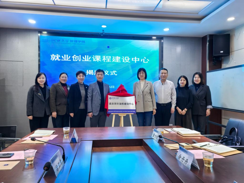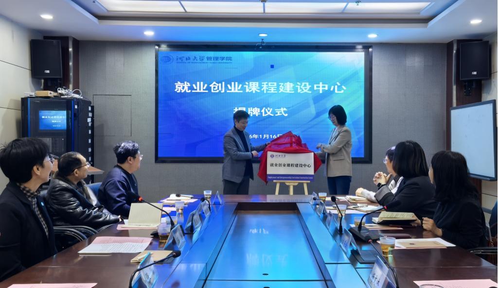 1月16日,河北大学管理学院与创新创业指导中心联合建设的就业创业课程建设中心揭牌仪式及研讨活动在管理学院举行。河北大学党委常委、副校长刘秀玲、河北大学教务处处长杨文杰、河北大学教育教学研究与教师培训促进中心主任张爱梅、河北大学创新创业指导中心主任李宏亮、管理学院领导及教师代表参加了揭牌仪式和研讨活动。